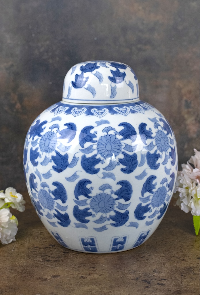 A lovely blue and white decorative chinese style bulbous porcelain jar with lid.