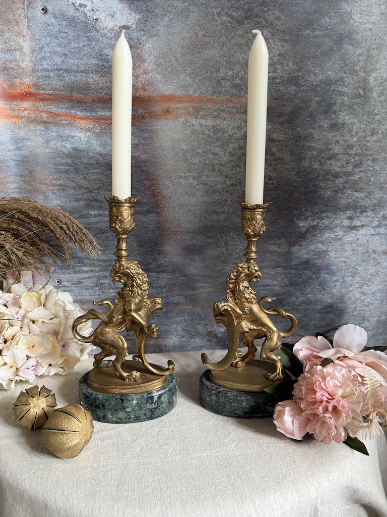 If you are looking for something to decorate your mantlepiece look no further than this gorgeous antique pair of candlesticks. The Lions Rampant* are made of metal and have a thick green marble base. Thought to be Italian and brought back from someone on a grand tour… *The Lion Rampant is a Scottish emblem and the Royal Banner of the Royal Arms of Scotland, representing the King of Scots and symbolizing strength, courage, and national pride. The term “rampant” refers to the lion’s heraldic pose—rearing up on its hind legs with claws extended, ready to strike.