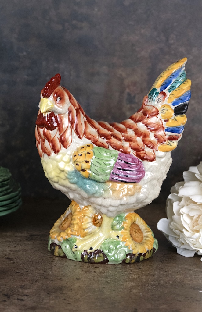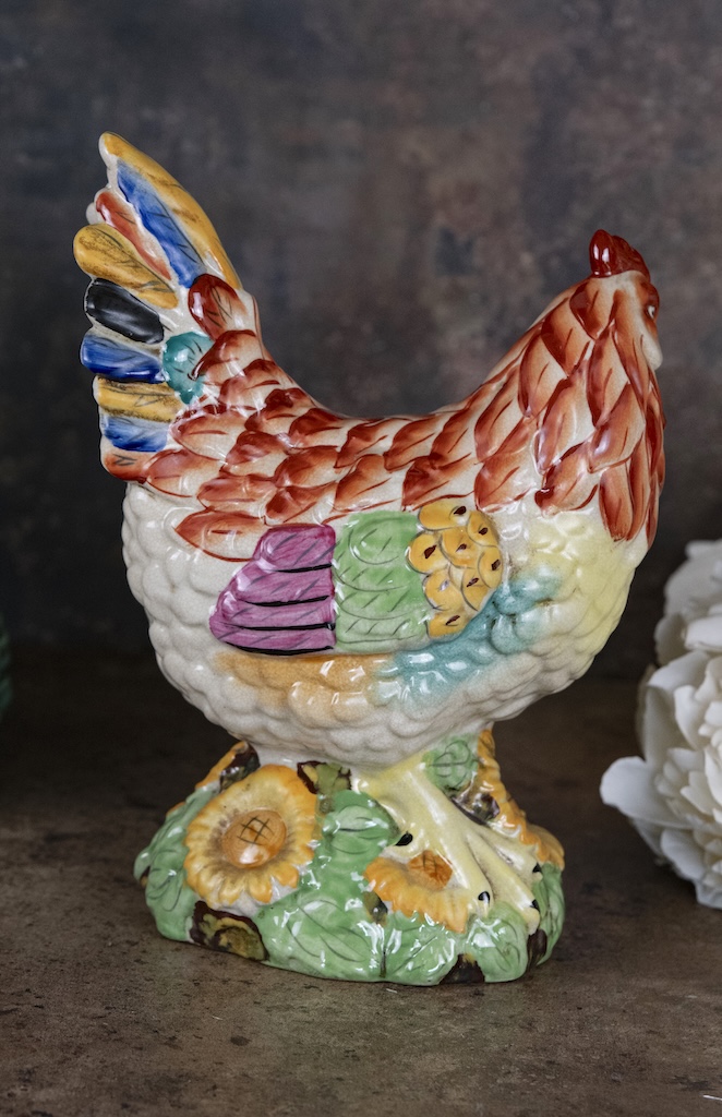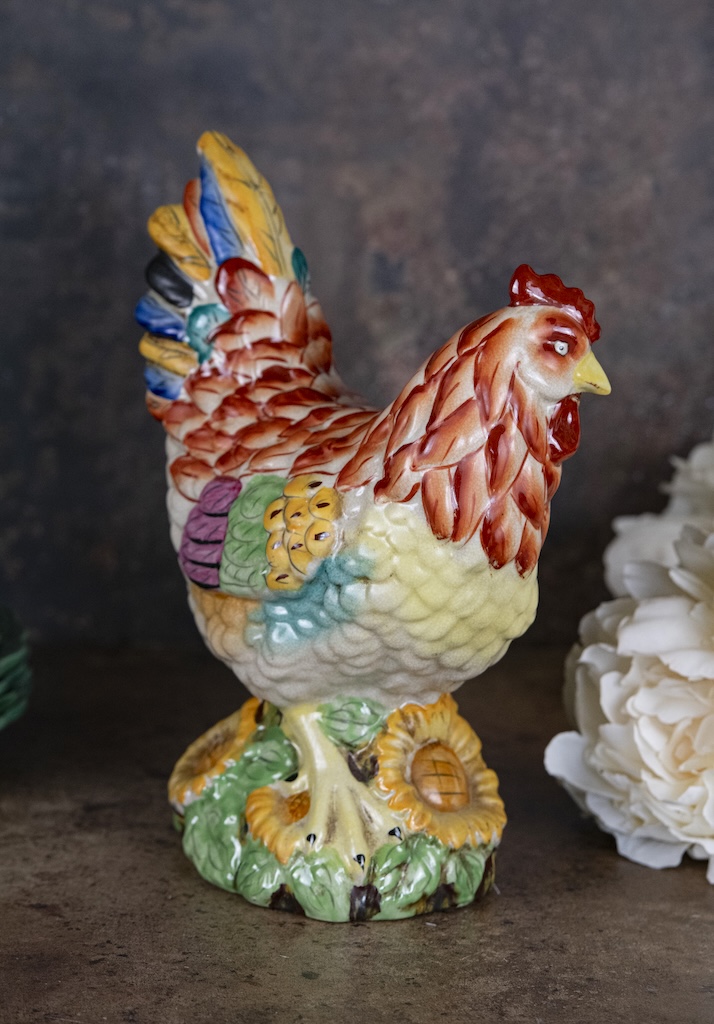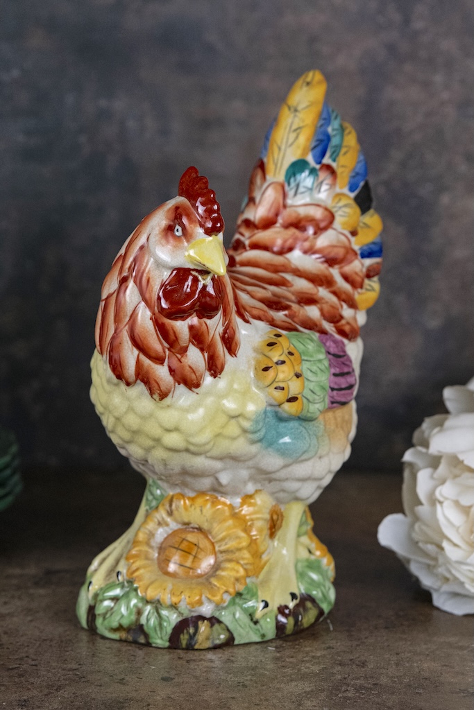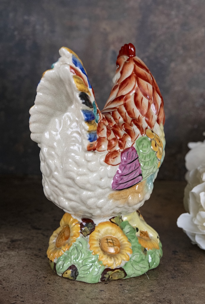 Brighten up your kitchen with this fabulous hand painted brightly coloured china chicken figurine. It has no makers marks – in very good condition.