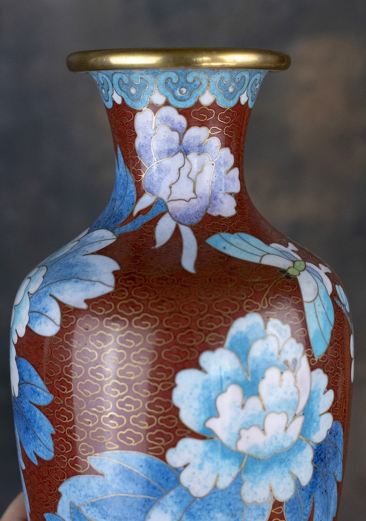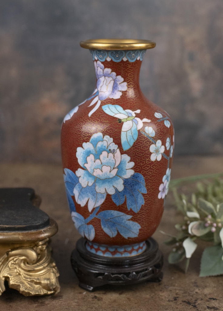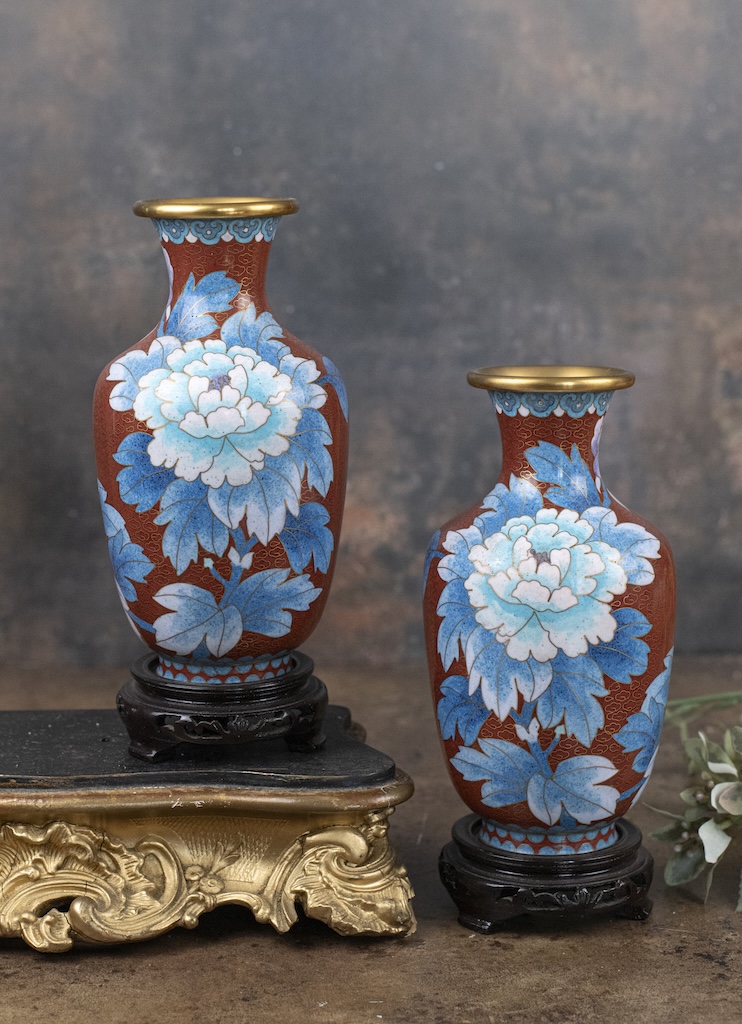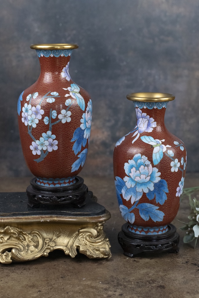 Add timeless elegance to your home with these exquisite Chinese cloisonné vases on wooden stands. Featuring a rich red/brown background and gorgeous blue peony flowers and blossoms twisted in intricate floral patterns and butterflies and gilt clouds these are a stunning example of traditional Chinese enamel artistry.