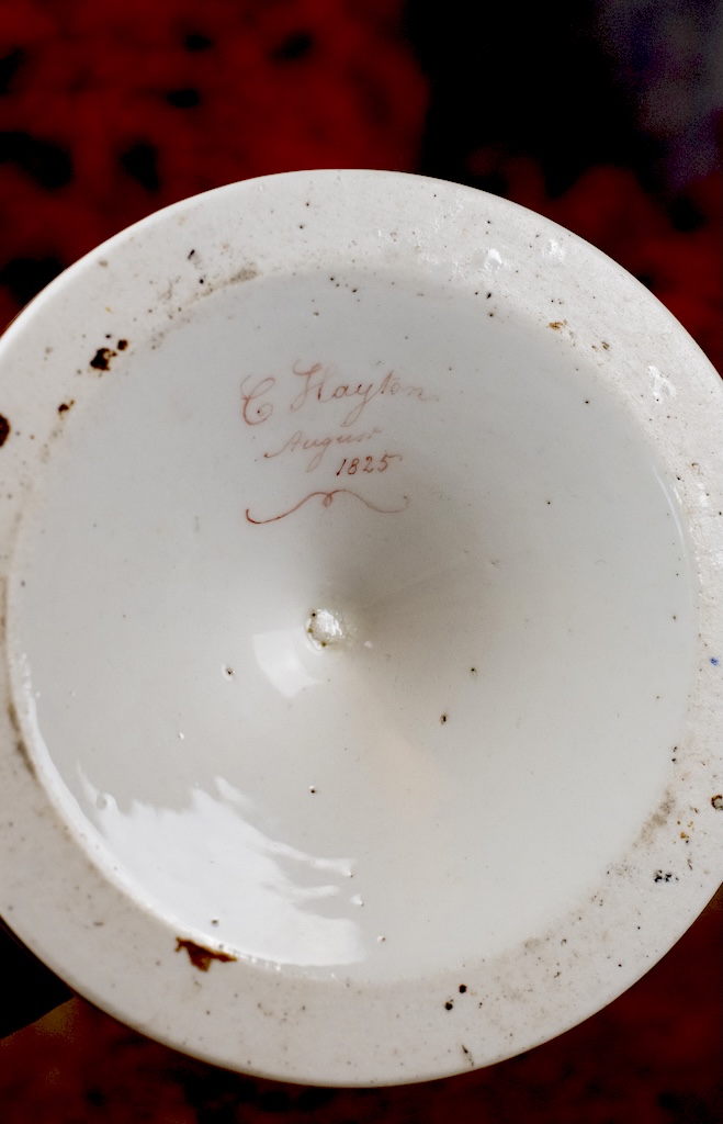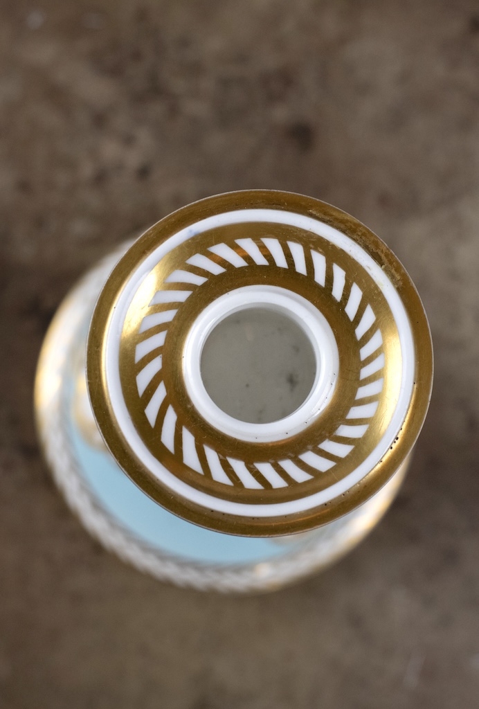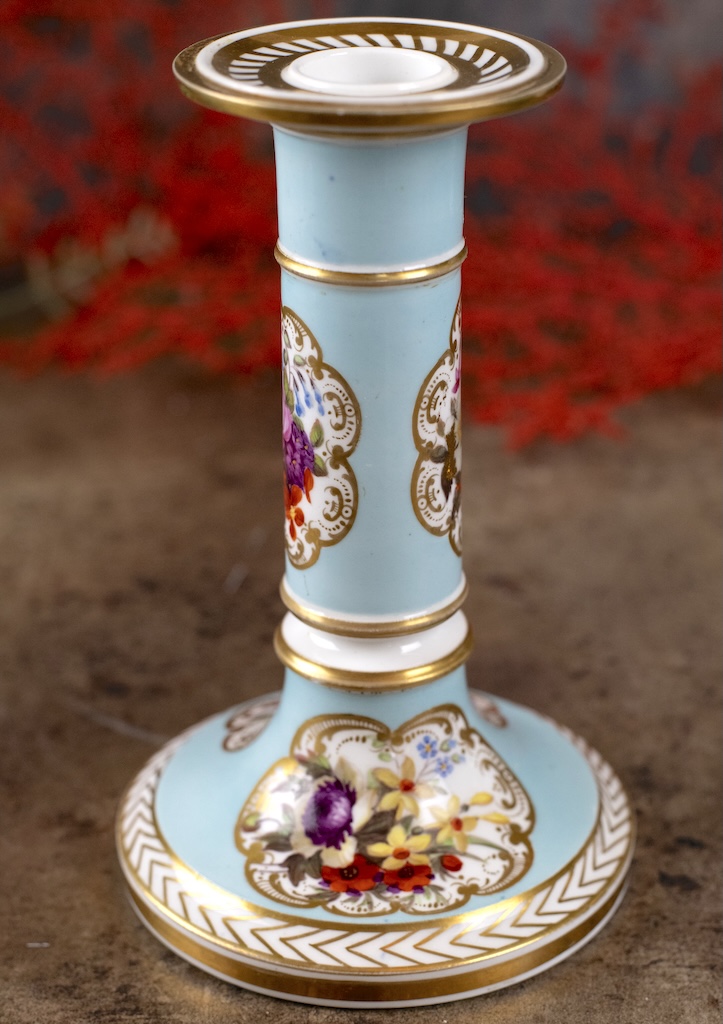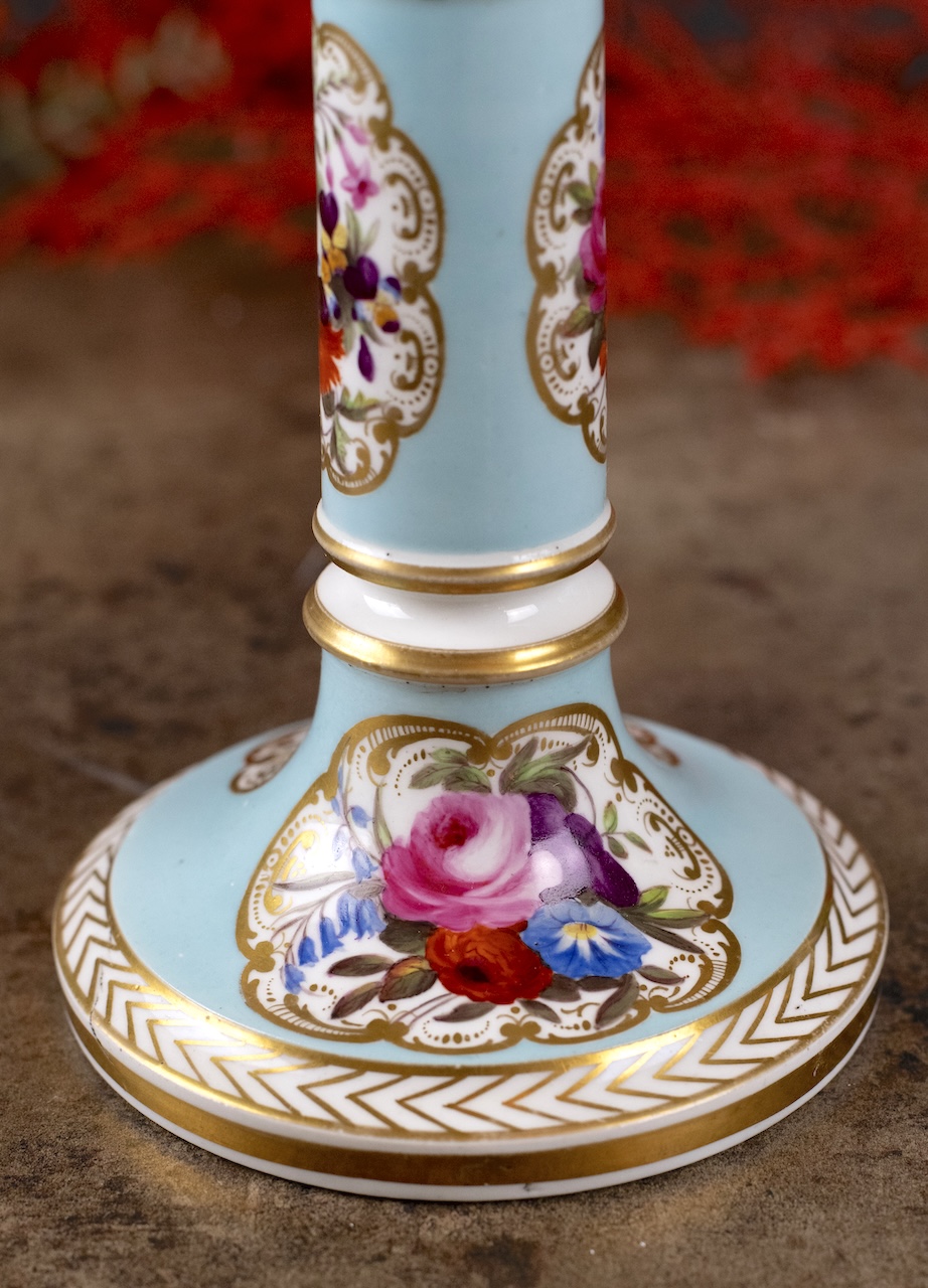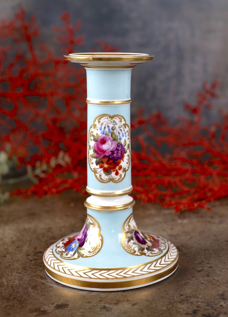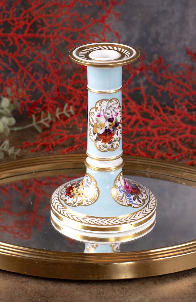 A really pretty and rare decorative candlestick from the early nineteenth century, made at the Chamberlain factory in Worcester, England. It is signed C Haytor and dated 1825. Mr and Mrs Hayton were celebrated amateur decorators and lived in Moreton in Herefordshire. They bought blank pieces of porcelain – painted them and then returned them to the factory for gilding. This example is a lovely colour turqoise and painted with gorgeous flowers.