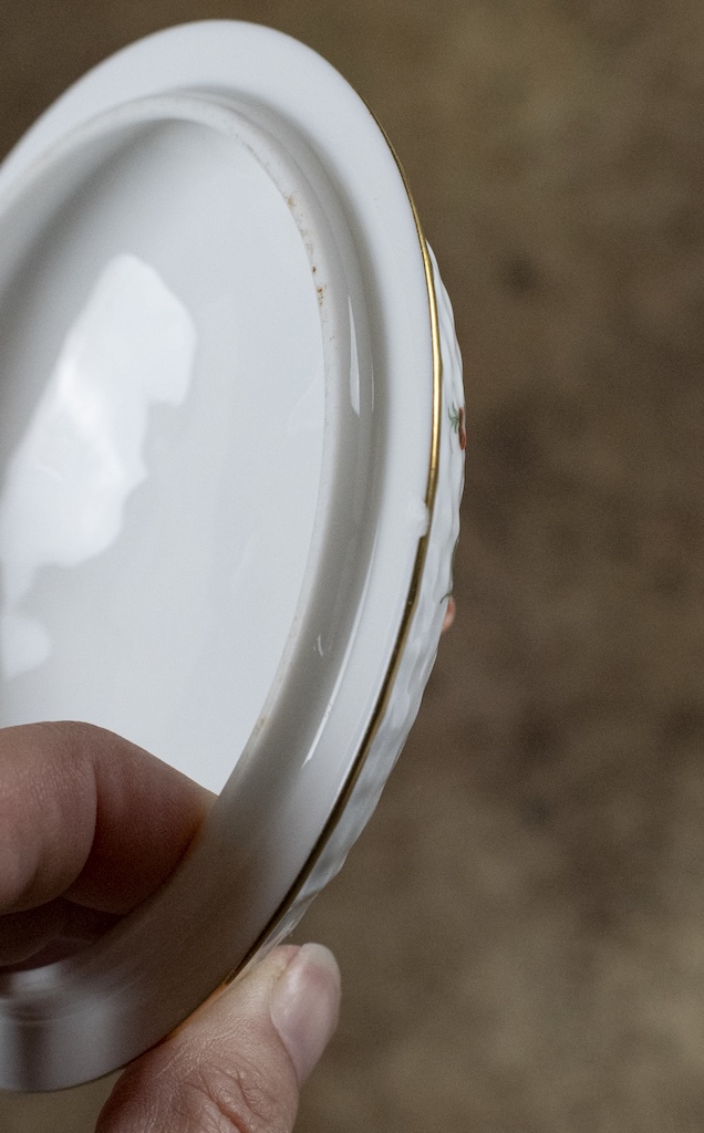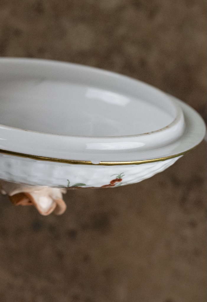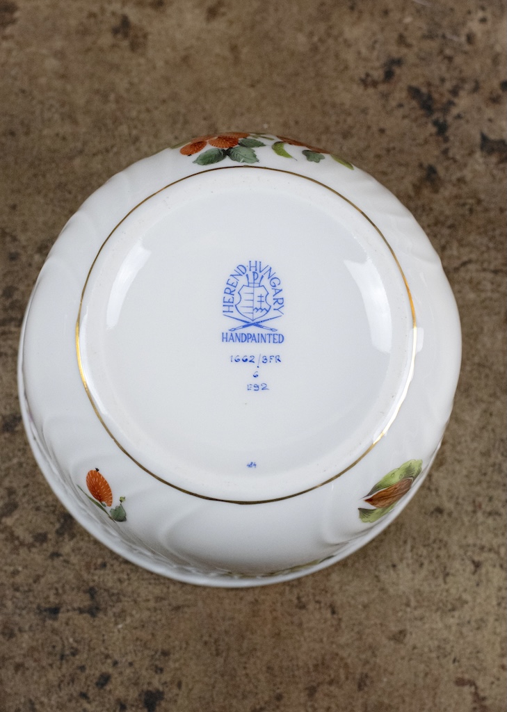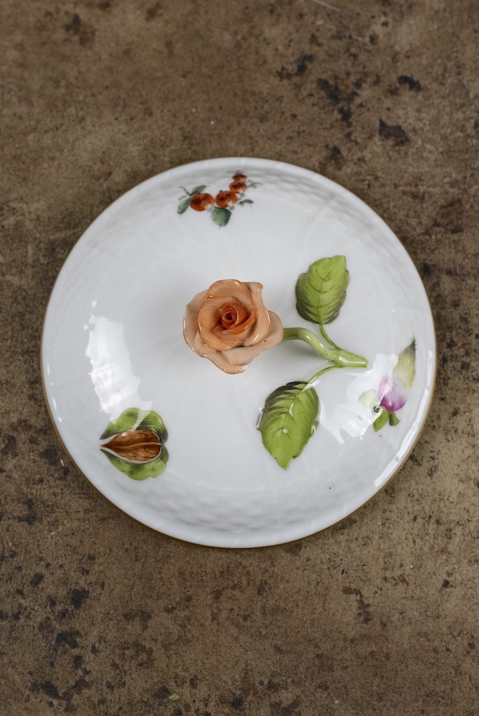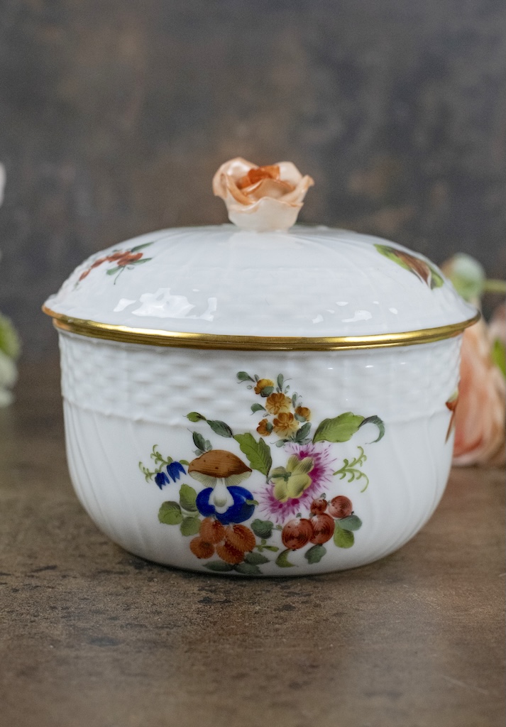 A lovely Herend hand painted porcelai round pot lid in the fruit and flowers pattern. It could be used as intended – a sugar bowl, but with its pretty rose topped lid it would look lovely and could be used for bits on a dressing table.