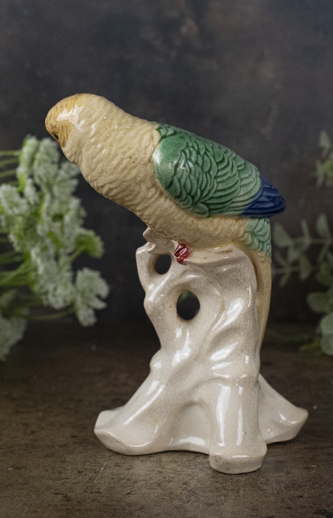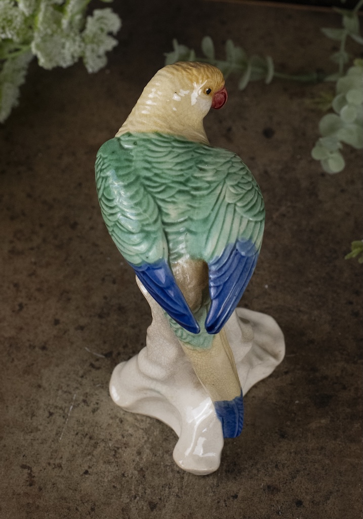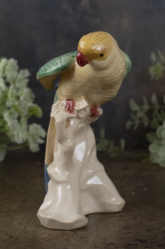 A pretty china figurine of a parrot with lovely yellow, green and blue colouring.