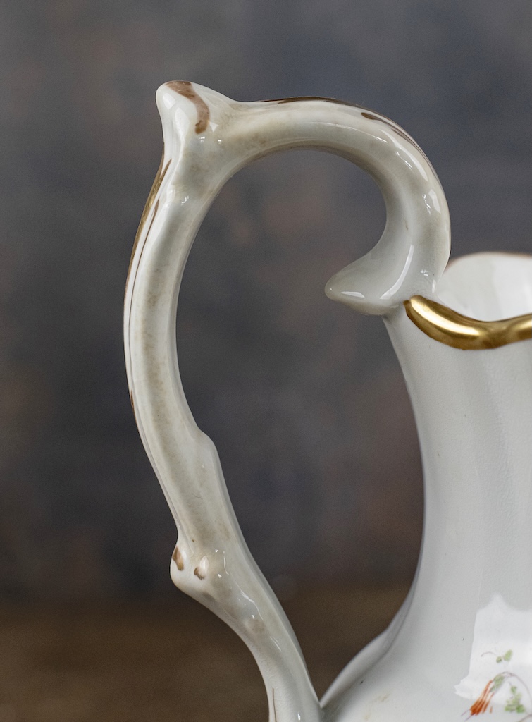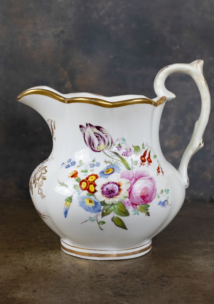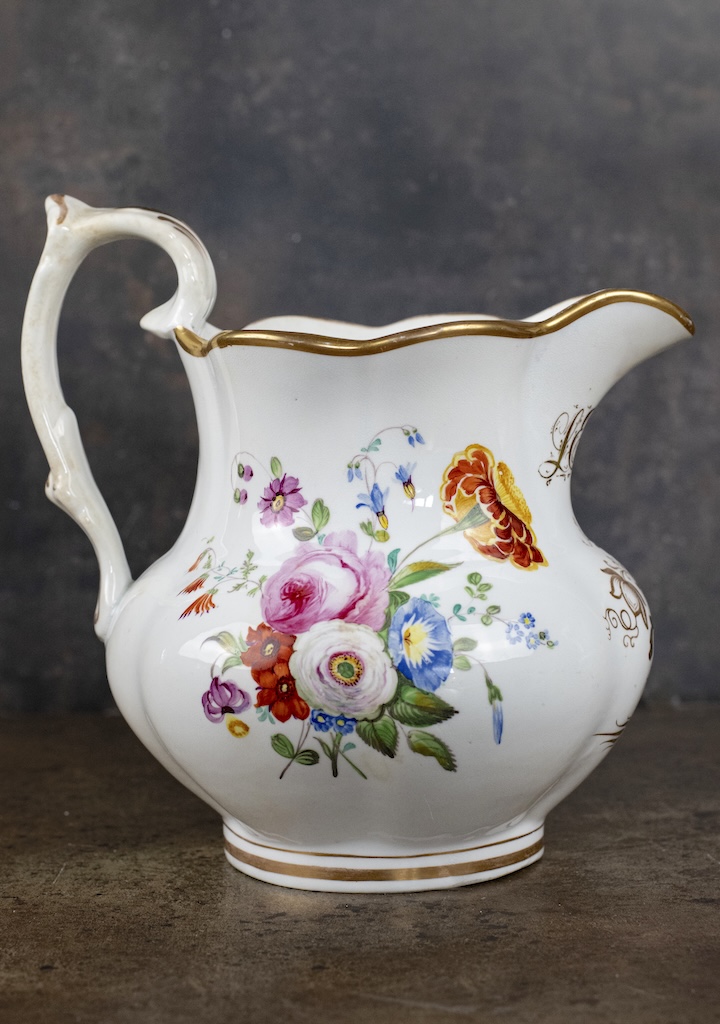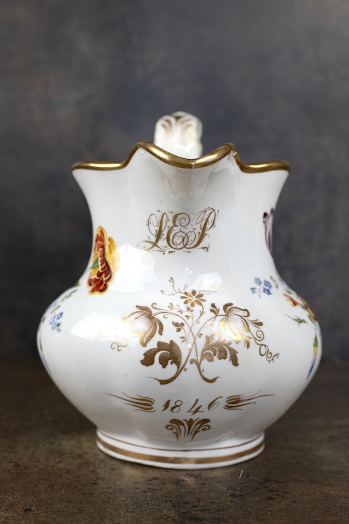 A beautiful hand painted large porcelain commemorative jug decorated with a profusion of flowers, beautiful gilt initals- possibly L & P and dated 1846. This was most probably a bespoke wedding or special anniversary gift for a couple and is a lovely quality piece that looks great on its own as a decorative piece or also could be used for flowers. It has no makers mark but could be Coalport, In really good condition with only slight browning to a few areas on the handle and body. See photos.
